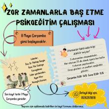 Zor zamanlarla sağlıklı bir şekilde baş edebilmeyi sağlamak ve ruh sağlığını desteklemek amacıyla ‘ZOR ZAMANLARLA BAŞ ETME’ PSİKOEĞİTİM ÇALIŞMALARI yapılması planlanmaktadır.